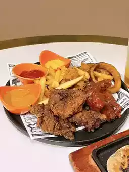 The platter has Sichuan spicy raw fried mouth chicken, crispy fried buffalo chicken hammer, fried chicken cartilage, fried onion rings, fried fries potatoes, and three sauces including mayonnaise, tomato sauce, spicy mouth water chicken sauce, I added $ 25 to add a wicked cheese sauce