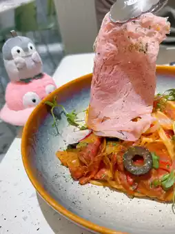Pasta chose Napoleon sausage ham pasta🤩 The restaurant's pasta is homemade😍 It tastes bouncy and smooth, chewy 👍 Each pasta is covered with rich Napoleon sauce🤤 It tastes rich and delicious😚 The spicy sausage and large pieces of ham add more deliciousness to the pasta🥰 It's really great🌟