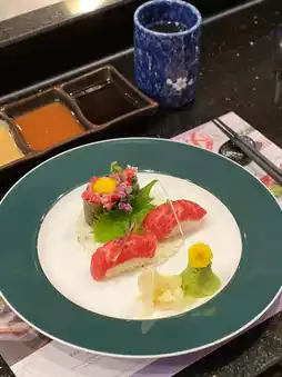 The marbling is fine and even, the raw beef is delicate and soft with a light aroma of oil, which complements the sourness of the vinegar rice. It is accompanied by yuzu pepper, bamboo charcoal salt and moonflower, and can be paired with crispy shrimp cakes.