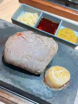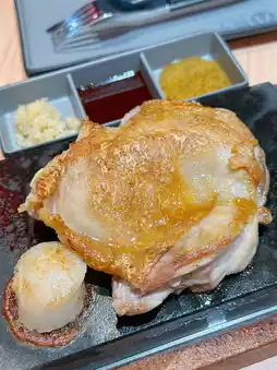 The chicken chops are thick and tasty🐔 Grilled on the hot stone slab until tender and juicy with crispy skin. Suitable for a variety of seasonings. I personally like to add garlic and Japanese soy sauce for a richer taste😋