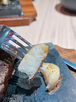 The beef tenderloin is thick, less fat but tender🥩The steak is grilled on a hot stone slab until the desired doneness♨️The outer layer is slightly charred, while the inside remains tender and juicy🧂Simply season with salt and black pepper to bring out the rich beef flavor😍Add $15 to any steak meal and you will get Jumbo Scallops, which are worth a try. The scallops are large, delicious and chewy.