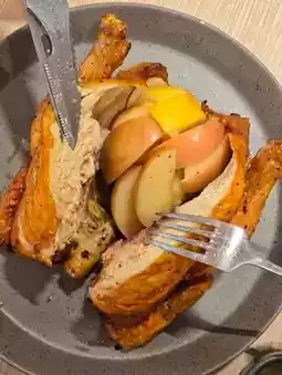 For the main course, we chose the apple lemon flavored roast chicken. The chef stuffed the chicken with apples and lemons and roasted it whole. When it was served, the aroma was incredibly enticing. Cutting it open revealed the stuffing inside, and the juices flowed out continuously. Even the chicken breast was very tender, and the drumsticks were even more succulent. Perfect for two people to share happily.