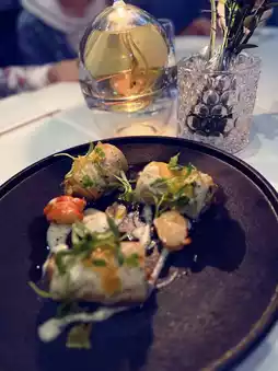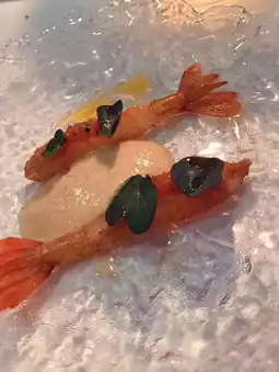 🌟Ceviche marinated prawn sashimi, tangerine honey wasabi juice