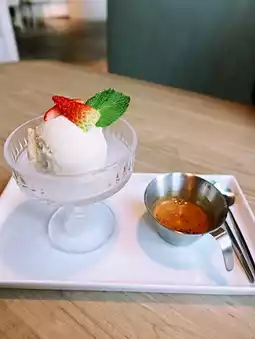 (HK$78): The soy milk ice cream is light and slightly sweet, topped with hot espresso, a blend of bittersweet