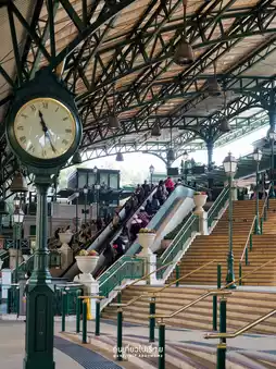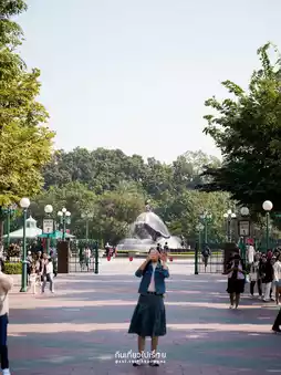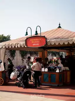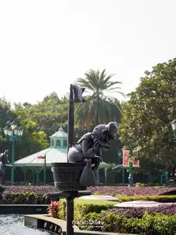 When you arrive at the station, the surrounding area is full of cute atmosphere. You can take pictures from the front of the station. Walk out a little further and you will find a large square in front of the entrance. This is a place where many people come to exercise in the morning. The atmosphere is lively with tourists waiting for the theme park to open. Another highlight is the fountain in front of the entrance with a picture of Mickey surfing on top. There is also a small shop selling Disney headbands for you to choose from.