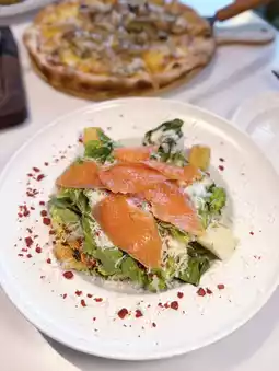 The smoked salmon melts in the mouth and is served with fresh vegetables.
