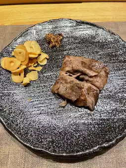 The beef is thinly grilled and wrapped in onions. The beef is soft and gluten-free, rich in oil, and crispy in garlic.