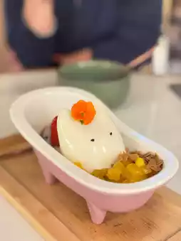 The bunny was so cute it was coconut juice cold and it was sitting in the tub! The pudding has a strong coconut milk flavour, paired with soft and smooth taro balls, red bean puree, sago and mango pieces. It is very sincere and good-looking.