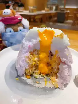 Ordered their recommended pink snow mountain scallop radish cheese fried rice ❤️ snow mountain shape is very cute ✅ cheese lava on the top made very carefully 🤗 cut the snow mountain pouring direct evil 😈 fried rice savory and delicious, rich ingredients, worth a try 👍