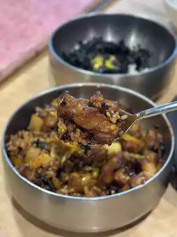 The portions are plentiful, the clerk will help put them in the rotary pan and fry until half cooked, then add the asparagus, corn kernels and garlic, and finally add the rice, kimchi and seaweed. The pork belly can be wrapped in lettuce and served with garlic slices and Korean spicy sauce