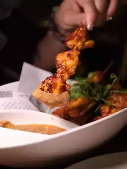 The satay chicken skewers are charred on the outside and tender on the inside, with a rich sauce that has a slight sweetness and layered spice. Every bite is full of flavor, and it’s even more delicious when paired with peanut butter