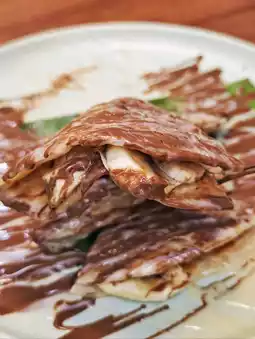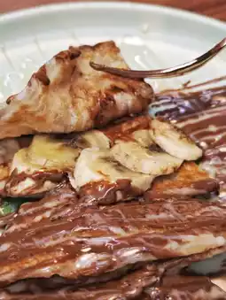 Thai street pizza with banana 🍌, condensed milk and hazelnut chocolate sauce, this combination is really evil, the toasted 🫓 pizza crust is a little crispy, the banana slices inside 😊 warm, topped with sweet condensed milk 🥛 and hazelnut chocolate sauce 🍫, really sweet!