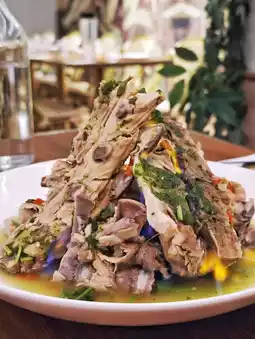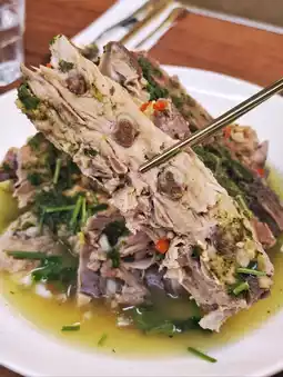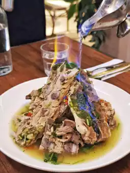 The signature Thai 🇹🇭 volcanic ribs are made of whole pork spine 🍖 stacked as high as a volcano 🌋, when the table is served, the staff will also add 🍶 rose syrup wine to light the fire, 🔥 so it tastes quite alcoholic, the meat 🐖 is quite soft and smooth.