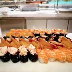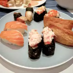 As soon as we entered, there was a self-service beverage area with hot water, iced tea, and a coffee machine. You can help yourself to whatever you like. Further in, there was an appetizer and salad bar with a variety of salads, appetizers, sushi, hot dishes, bread, and soup.