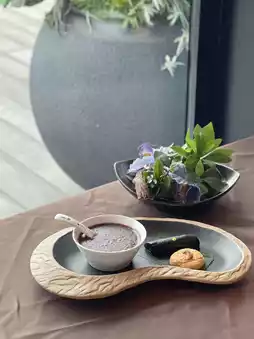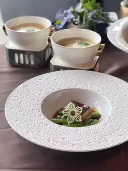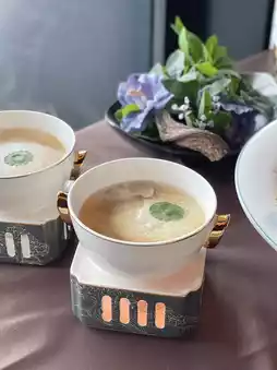 The tender tofu is cut into chrysanthemums. The soup base is delicious with a light aroma of matsutake.
