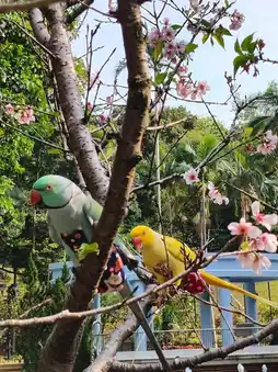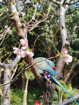 🌸 Tsuen Wan Shing Mun Valley Park, at the entrance next to the Shing Mun Valley Swimming Pool, there is a rose garden on the left with a few cherry blossom trees. I happened to see a local resident 'releasing' parrots🦜. The parrots are lively and love flowers just like humans, truly a scene of birds and flowers.