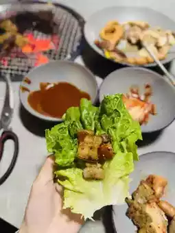 Sitting outside is really much more atmospheric😚, the weather is cool and quite comfortable. It's been a lot different since I haven't been here for a while 🤔, now I'll be served a plate of food, lettuce 🥬 and Korean spicy sauce first, then I can order on my phone 📲. The kiln chicken is ready to grill 🔥, so you have to wait for a while ⏳, you can eat Korean barbecue first. It is recommended that if you are determined to eat a few, to tell the clerk as soon as you get there will be better😌.