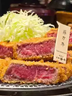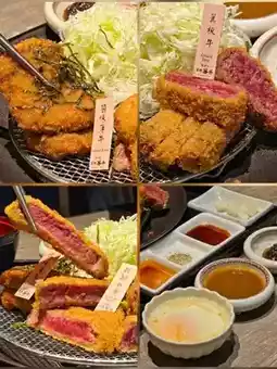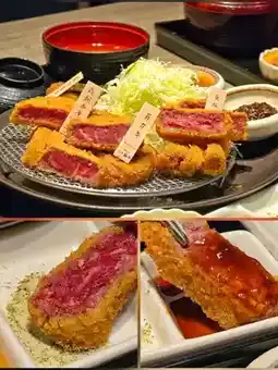 We ordered the restaurant's most popular Four Cuts Beef Set, which includes four different cuts of katsu beef: grain-fed sirloin, filet, ribeye, and marinated thin beef. The beef is quickly fried for about 60 seconds to achieve a medium-rare to medium doneness, with the center still pink but without any blood. If you prefer your beef more well-done, the restaurant provides a pan for you to cook it a bit more. The sirloin is the most tender, while the filet and ribeye have a richer flavor. The thin beef has a slightly minced texture, and the marinade is very flavorful. The katsu beef can be enjoyed with curry sauce, miso sauce, steak sauce, sansho pepper salt, or vinegar sauce, each offering a unique taste. The set also includes an onsen egg, unlimited rice, Kyoto cabbage, and miso soup.