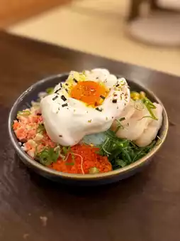 Once served, it really "wow ~" 🤯 There is a "cloud egg" on the face, the egg white is beaten into a cloud shape ☁️ Then put on the soy sauce stained half-cooked egg yolk 🍳 poke through the egg yolk flowing into the sashimi strips, very sweet ~ 😭 Mint octopus grains with salty flavor is very bouncy , ingredients also include crab seeds, crab sticks, cucumber, corn, Chinese salad, etc., fresh and appetizing, mixed with some vinegar rice really bite after bite can not stop!