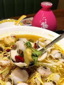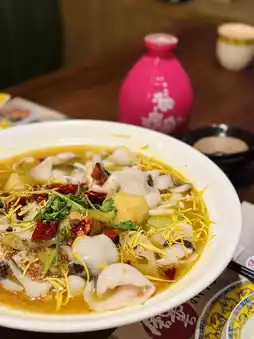 The sauerkraut fish is available for 2/4 people, and you can choose the spiciness/numbingness/sourness, and you can also choose to have less oil. The hot and sour soup base is cooked with yellow chili peppers, Hainan yellow lantern peppers and dried chilies, paired with pickled vegetables, and then topped with boiling hot oil and chrysanthemum petals. The soup is sour and slightly spicy. The tender fish fillets and the sour and spicy taste of sauerkraut complement each other, forming a unique flavor that is appetizing and delicious.