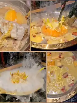 The soup is called the restaurant's new soy milk pot. The soup has smooth soy milk and fresh chicken soup, as well as large pieces of honeydew melon and dragonfish. Adding the soup creates a smoky, fairyland-like sea of flowers. The soup is very fresh and sweet because of the addition of honeydew melon. You can drink a bowl before having hot pot.