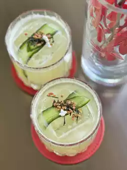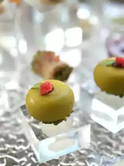 The cucumber slices are wrapped in fresh and sweet lobster meat, and the ends are dipped in crushed pistachio.