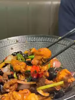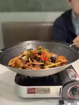 One-Eating Mushroom Chicken Pot: Plenty of portion, large pot, add a lot of mushrooms, bamboo shoots, red pepper, onion, shallot, garlic, etc., rich mushroom fragrance, chicken texture tender, soft, chicken pieces after frying pan full of flavor, very tasty.