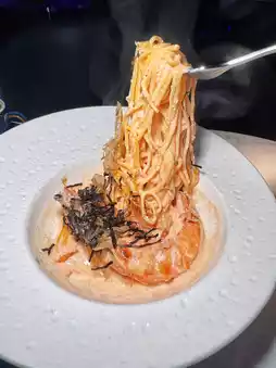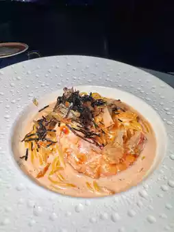 The pasta is covered with mint sauce, seaweed and shredded salmon taste more Japanese!