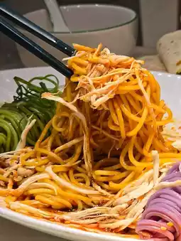 Made with three different colored cold noodles, this dish is visually appealing. The noodles are chewy, and the sauce at the base is not only spicy but also slightly tangy, offering a fragrant and appetizing taste.
