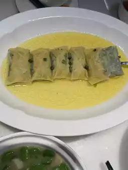 The tofu skin is wrapped in emerald green cabbage and delicate minced meat.