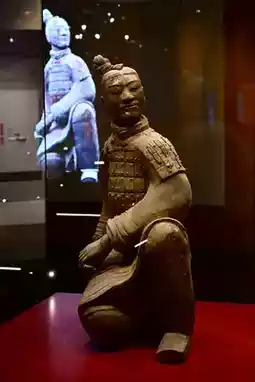 The key exhibits include three Qin terracotta warriors, which are national first-class cultural relics and are on display in Hong Kong for the first time. They include the highest-ranking senior military officer figurine unearthed from the Qin Terracotta Warriors and Horses Pit, a kneeling figurine presumably playing a musical instrument, and a kneeling archer figurine with red paint still visible on its armor dating back more than 2,000 years. The three Qin terracotta warriors are placed independently in transparent display cases with glass on all four sides in the exhibition hall, allowing visitors to appreciate them carefully from multiple angles.