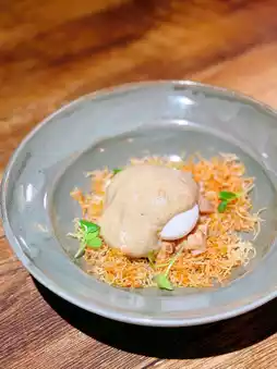 The Japanese Ranou egg is slow-cooked at 65°C and is very runny. It is paired with tender chicken and truffle sesame sauce, and the crispy potato shreds at the bottom. The flavors blend together and are very memorable.