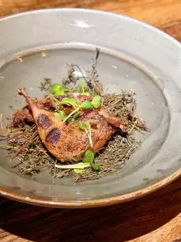 The mature pigeon thigh has a crispy outer layer and tender meat.