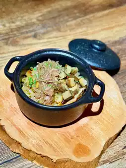 The baked rice is prepared as soon as it is ordered, with each grain distinct and full of the aroma of oil. It is also mixed with slow-cooked shredded duck meat, moist intestines, and spicy sausages. It is so salty and delicious that you can't help but eat one bite after another.