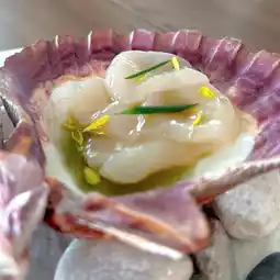 The scallops are lightly marinated with kombu oil. The taste is very fresh and fragrant. The scallops themselves are fresh and soft.