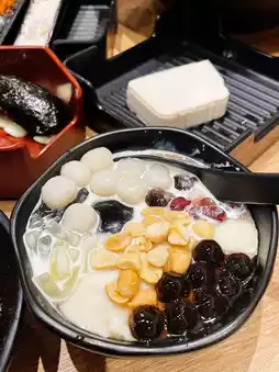 Baifu tofu with various ingredients such as elixir ice cream, Q-bomb pearls, small balls, soft red beans and peanuts