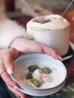 在限聚令前最後一次六人一桌聊個不亦樂乎實在太幸福了🤍最後以班蘭椰子湯圓劃下句點,先咬一半,流心椰糖跟班蘭外皮融合會剛剛好。