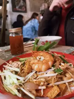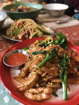 泰式復古小販鐵牌裝飾、挑高的樓底空間、地道的餐具,連續4年登上#米芝蓮 必比登推薦的人氣泰菜#泰麵,完全與旁邊的藍屋建築群融為一體。一行六個女生點了整桌😍所有菜都想試一輪!鑊氣紛陳的炒闊河粉完全為之一亮,必點🌪 很油很油就是多油才好吃河粉必須要配合鑊氣,不管在哪國料理都是畫龍點睛之筆。所以即使是冷冷的初六也要配清爽椰子荳奶冰沙來平衡一下🥥剛!剛!好!