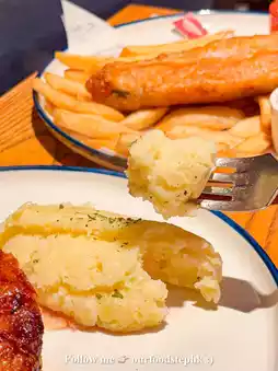 The portions are quite large, with chicken breast and chicken thigh. The mashed potatoes are smooth and dense.