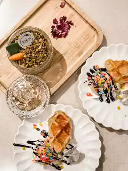 The waffles are crispy on the outside and soft on the inside, and the crispy and fragrant layers like a croissant are surprising! Served with icy vanilla ice cream, the combination of hot and cold brings out the sweetness.