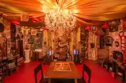The room's walls are covered with fabrics featuring diverse patterns and textures, while various decorations and furnishings evoke different cultures and regions. Upon closer inspection, most of the items are sourced from Hong Kong, and the games reflect both Japanese and local characteristics. This space blends cultural elements from different regions, immersing visitors in a multi-dimensional world.