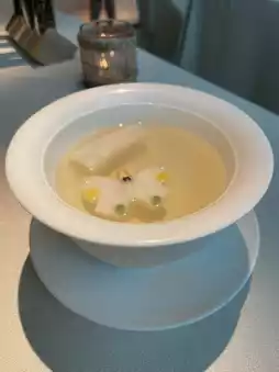 The soup is very clear, actually made with a variety of ingredients such as Jinhua ham, pork bones, chicken, etc. prepared for 8 hours, then used a filtering method to make the soup clear, but the taste is very rich.