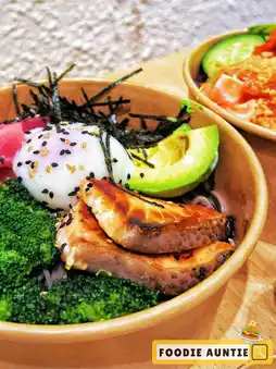 🐔 Another bowl is called "The Ultra Omega", perfect for friends who want to eat warm cooked food. There are two pieces of pan-fried salmon, broccoli, avocado, poached egg, sesame, and seaweed strips. The key is to serve with soba noodles, which is absolutely filling. Drizzled with homemade soy sauce, delicious.
