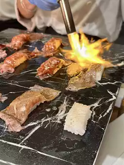 After seafood, it's time for meat! The must-try is the Saga Wagyu teppanyaki, freshly sliced and grilled with garlic chips and green onions, delivering an irresistible aroma. The grilled U.S. beef is tender and juicy, with rich marbling similar to Wagyu. The birch pork sukiyaki is surprisingly sweet and flavorful, showcasing the unique taste of pork.