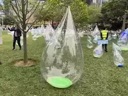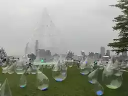 Under the giant 18.8-meter-tall water droplet installation are over a hundred roly-poly little water droplets.