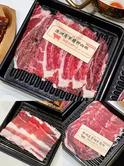 Meat options include Australian chuck eye roll with rich marbling and intense beef flavor; premium selected brisket with strong flavor and juicy texture; Australian grass-fed lamb shoulder that is tender, smooth, not gamey, moderately firm, and juicy.