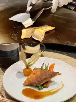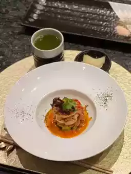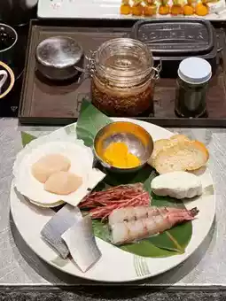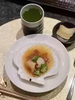 Hokkaido scallops with thick, snow-white meat, soft, delicate, and extremely sweet, accompanied by slightly slippery okra and umbrella mushrooms.