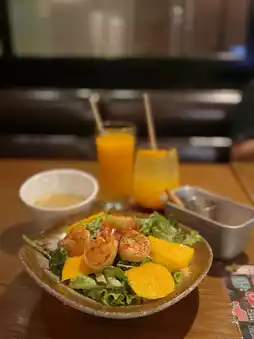 The weather is hot, and this salad is really refreshing. The salad greens are crisp ๐ฅฌ, the tiger prawns are big and bouncy ๐ฆ, very appetizing~