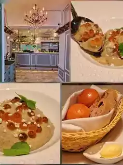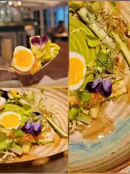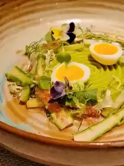 Another appetizer with a very delicate presentation, featuring a green panna cotta base, garnished with asparagus, quail egg, salad greens, and dressed with a sweet and sour eight-treasure vinegar sauce, refreshing and appetizing.