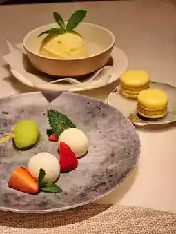 Desserts included macarons, kiwi sorbet with vanilla panna cotta, and yuzu ice cream. The dessert quality was good, beautifully plated, perfect for photos.